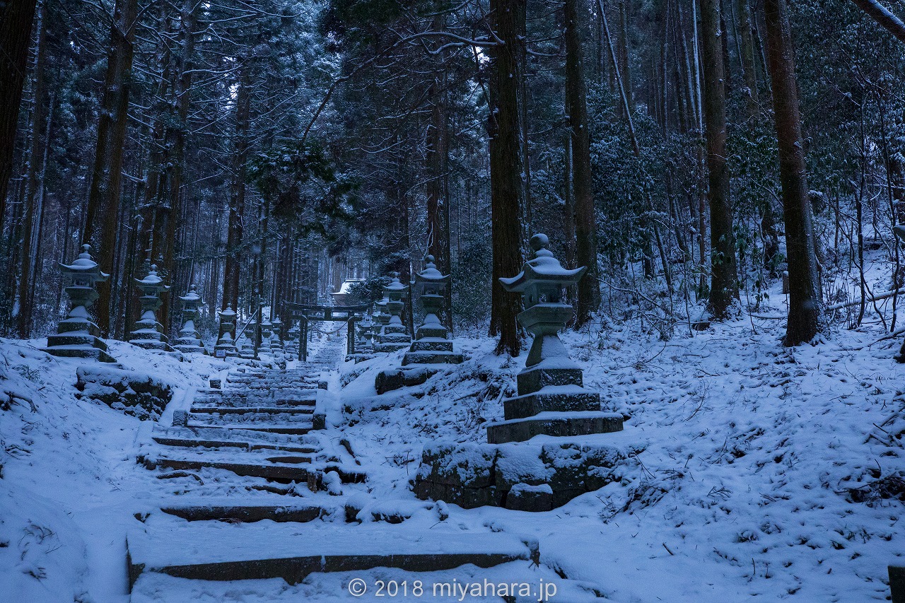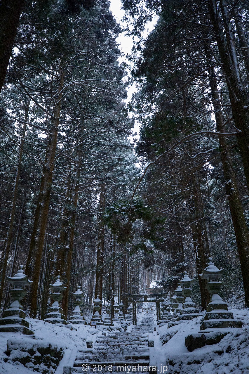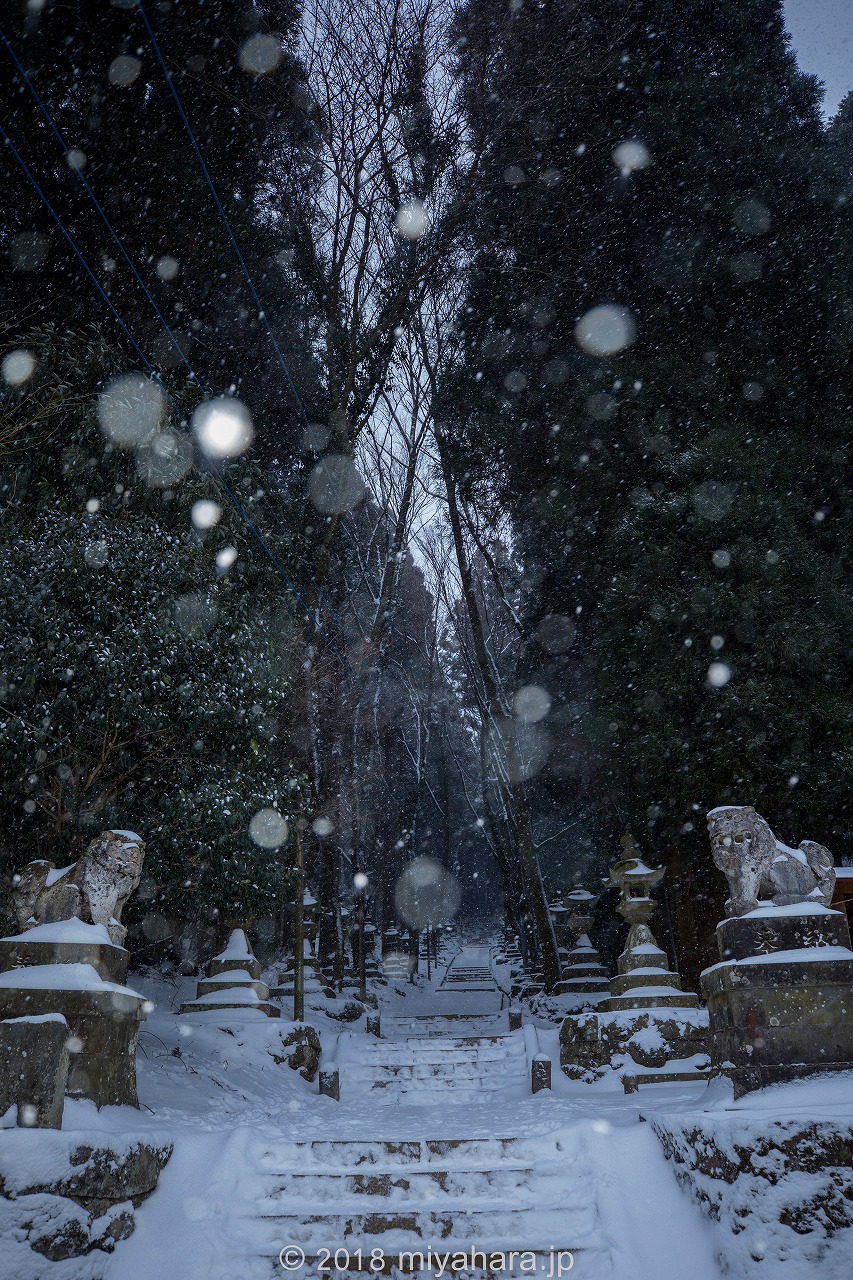 無人の参道、雪が積もり良い感じです
